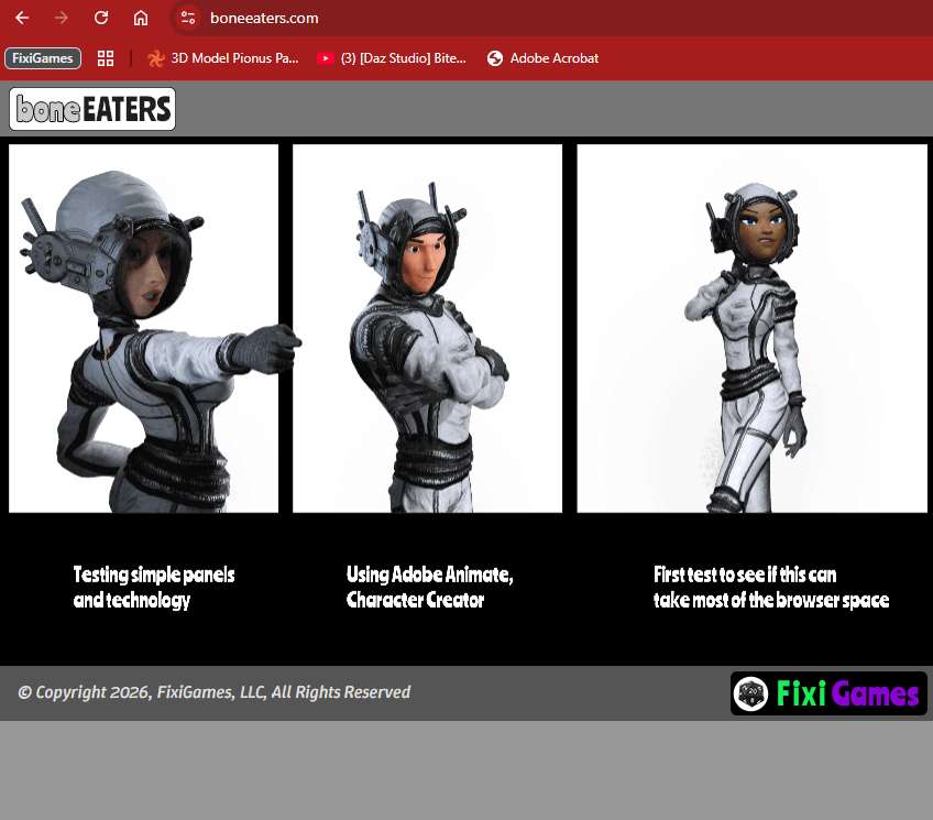 I want to make the boneeaters website basically an animated comic that takes up the full size of the reader’s browser. I want it to be a simple interface, clear what is showing and what the reader can do, and be super clean. And I want it to just work in any modern browser with no plug-ins, downloads, etc.